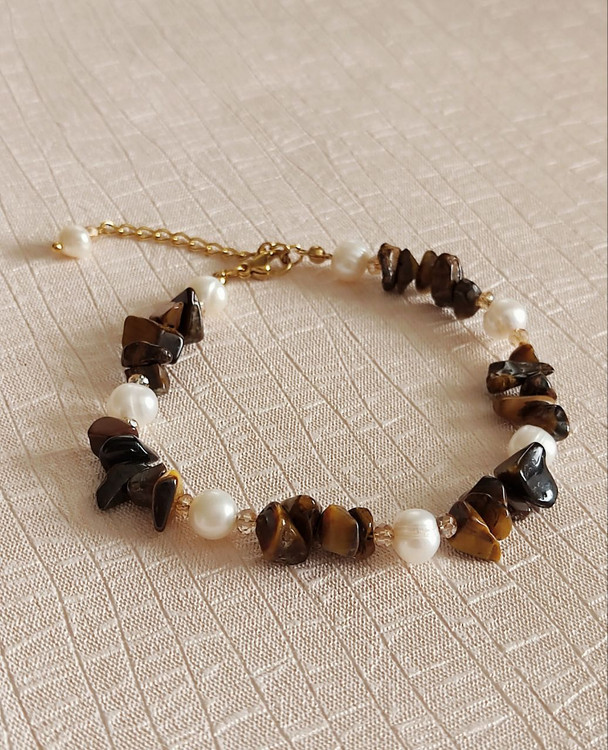 دستبند زنانه سنگ چشم ببر و مروارید پرورشی اصل برند شاران
